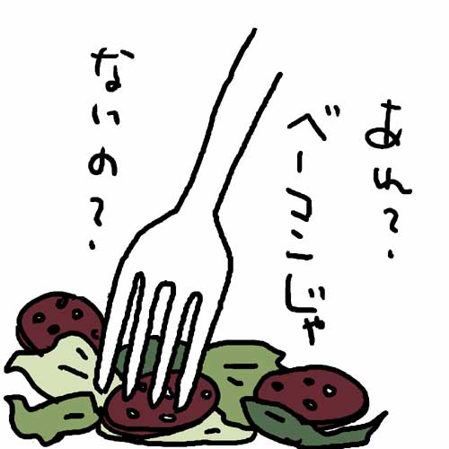 アメリカの友だちが日本語を話せるように ならないかなあと、ずっと待っていましたが、 いつまで経っても上達する気配がありません。 いい加減、がまんも限界です。 しかたがないので、めきし子さんが 勉強することにしました。 めきし子さんの日常で英会話 [ 英語で言いたいこと]LESSON 1 今日のテーマは、 ダイエットで、シーザースサラダ ばかり食べている子どもに、毎日ベーコンばかりでは あきるだろうからと、サラミを買ってきた時に 使う英語です。 I bought this salami because I thought you would