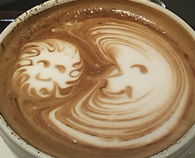 写真は、偶然、MEGさんから送られてきた ドトールコーヒーのバリスタさんが描いた 太陽と月。ナイスタイミングでしょ。 タイミングよすぎ!!(笑) おかげで、イラスト描く必要がなくなりました。