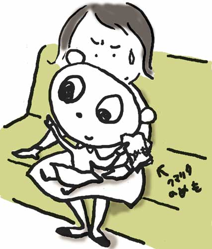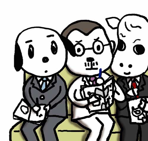 なぜか、クマリタ社長をひざの上に乗せて、 めきし子さんは座っている。 向かい側のソファに、ここの社員と 思われるかぶりもの系が座っている。 3匹人。 その中は、人なんだけど、 かぶりものが動物なので、どう 数えていいかわからない。 だから、…匹人ということにしてみた。 犬っぽいもの、サルらしきもの、そしてひつじ執事。 小さいソファに、大きなかぶりものの3匹人は、 けっこう窮屈そうだ。 「今から、クマリタ社の会議を始めます」 と、言いながら、めきし子さんのひざの上で、 クマリタ社長は、あのたべいもメモを開いた。 向かいの3匹人の手にも、いつの間にか 同じメモ帳があった。 「実はですね。こほん」 クマリタ社長が軽くせきばらいをした。 すると全員が、身を乗り出すようにして、 いっせいにメモを取り始めた。 ??????? こほんって、せきしただけでしょ。 ここメモ取るとこですか? まあ、いいか。 とにかく会議が始まってよかった。 これで、めきし子さんが どおして、ここに呼ばれたのかが、 わかる。 ………続く。 クマリタ社長、更新しました。今まで分は、テーマ、クマリタ社長 で読んでください ![]() …前回は、クマリタ社長の会社に2度めの来訪で、終わった。 http://marimoko.blog.shinobi.jp/Date/20080801/1/ クマリタの会社は、代々木にある、とある ビルの6階。以前訪問した時は 一階にあったのに…、 2度目に訪ねた時は6階に変わっていた。 なぜ? クマリタ社長には、常にこういう…え?え?なことが つきまとう。 たとえば、さっきから、クマリタが 私のひざの上にいることなども……。 めきし子さんが、通された応接間には、小さな、 子供サイズのようなソファが二つ 向かい合わせに置いてあって、 奥のソファにはすでに、かぶりものした クマリタではない方たちが二人座っていた。 だいぶ前に、社会人のマナーの本の お仕事をしたことがあるけれど、その本では確か、ゲストの人が 入り口から遠い方に座るとなっていた。 でも奥のソファは、かぶりものさんたちが座っている。 だから、めきし子さんは、手前のソファに座ったのだが、 すかさず…クマリタ社長は、なんのためらいもなく、 めきし子さんのお膝の上に座ってしまった。 なぜ? なんの決まりごとだ?これって…。 そして、向かいのかぶりものたちだけど…。 犬っぽいのと、あきらかにサルらしきかぶりもので、 そこにさっきのひつじ執事が加わった。 犬、さる、ひつじ。 部屋には、かぶりものが4匹人。 かぶりものしてないのはめきし子さんだけなのだ。 このクマリタ社長の会社には、かぶりものの方しか いないのだろうか…。 「さあさあ、みなさん、めきし子さんが来ました」 クマリタ社長が、向かい側のかかぶりものたちに向って、話し始めた。 私のひざの上で。 ………すぐに続きますように。
