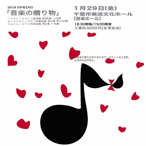 × [PR]上記の広告は3ヶ月以上新規記事投稿のないブログに表示されています。新しい記事を書く事で広告が消えます。 こんばんは。敬愛するみなさま。 たいへんお久しぶりです。お久しぶりですが、 いきなり、 めきし子宣伝部長からのお知らせです。 ハイドン / ピアノ三重奏曲 第28番 ニ長調 モーツァルト / ピアノ四重奏曲 第2番 変ホ長調 フォーレ / ピアノ四重奏曲 第2番 ト短調 越田美和 Piano 伊藤亮太郎 Violin 鳩山曜子 Viola Cello 平田昌 後援(財)千葉市文化振興財団/千葉市音楽協会 主催・チケットのお問い合わせ/レガロ企画 http://www.regalokikaku.com/Regalo/welcome.html チケットのお取り扱い/ 京葉銀行文化プラザ/043-202-1790 千葉市民会館/043-224-2431 千葉市文化センター/043-224-8211 千葉市若葉文化ホール/043-237-1911 千葉市女性センター/043-209-8771 お座席に限りがあります。ご予約、お求めはお早めに。 今年も、めきし子さん、めきし子さんのブログ、どうぞ よろしくお願いします。 PR 本日のネイチャーサイエンスカフェは、