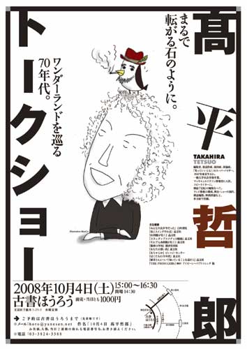 高平哲郎 トークショー /ワンダーランドを巡る70年代。 「笑っていいとも!」のスーパーバイザーの 高平さんは、 タモリさんや赤塚不二夫さんとの関わりは 知られていても、 宝島の前身、ワンダーランドを世に送りだした人と いうのは意外と知られていない。 70年代の始め、植草甚一責任編集で始まった ワンダーランド。そこから、どうして笑っていいとも!……? 聞いてみたいくないですか? 場所 古書ほうろう http://www.yanesen.net/horo 東京都文京区千駄木3ー25ー5 tel./fax. 03-3824-3388 日時 10月4日(土) 開場14:30/開演:15:00 料金 1000円 予約 古書ほうろうまで(先着順です) ・メール:horo@yanesen.net 古書ほうろう PR